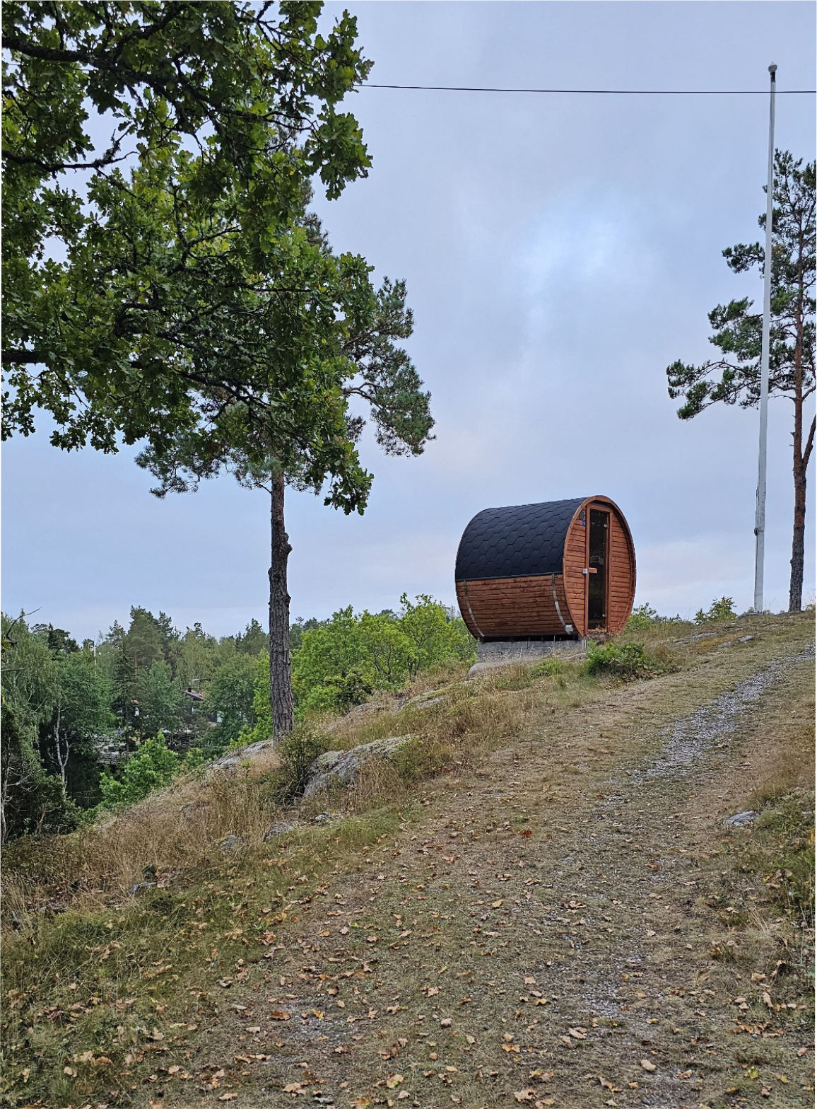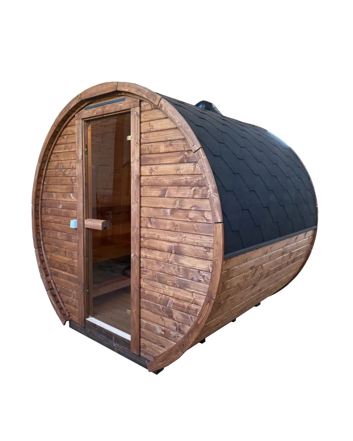 → Fully assembled and ready-to-use 2M sauna barrel made of spruce wood.