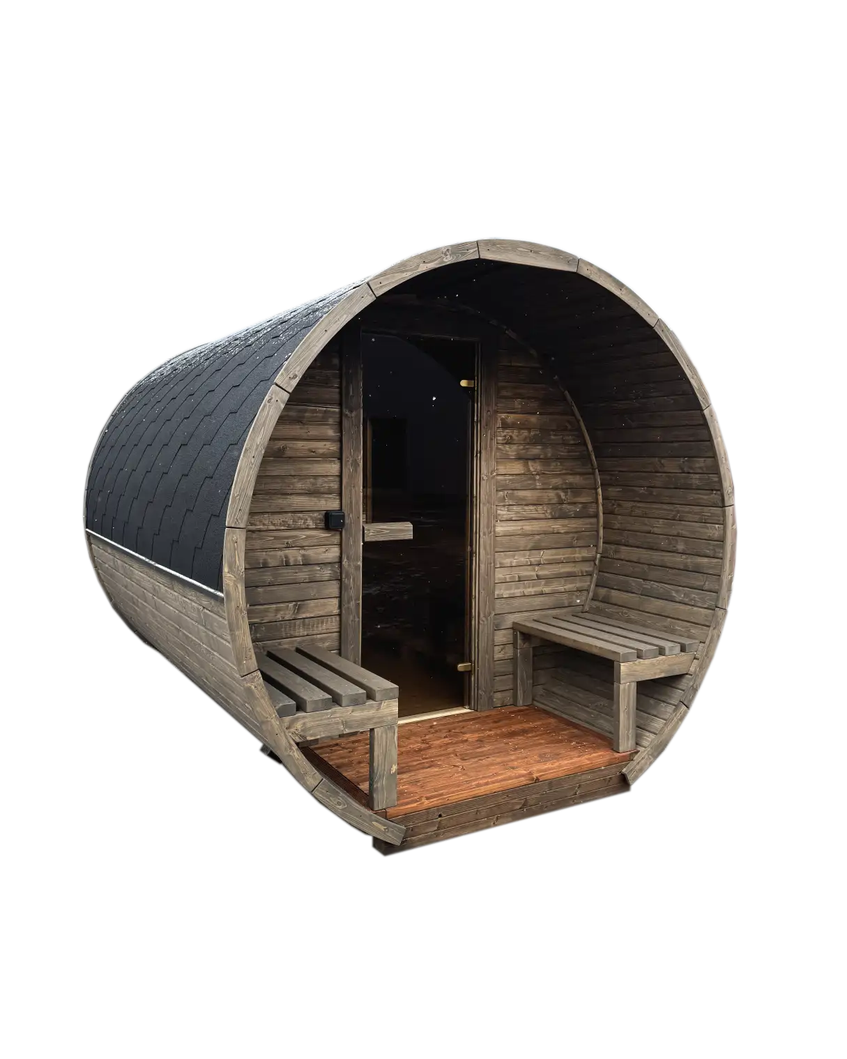 → Fully assembled and ready-to-use sauna barrel made of spruce wood.
