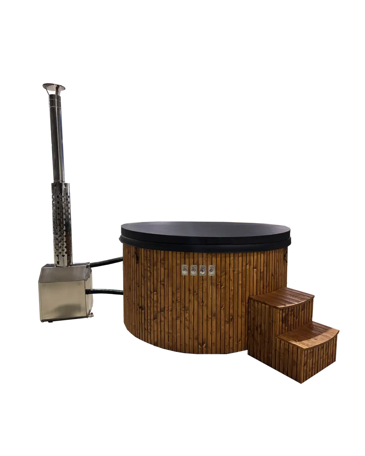 The Premium Package of Extras includes heater pipe protection, box closed-type stairs, an insulated leather lid for the hot tub, two drink holders, and polyurethane foam insulation, an 8-jet hydromassage system, and underwater LED lighting. It is available for 200 cm and XL diameter hot tubs, as well as Quadro and Ofuro.